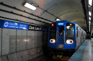A train pulls into the Clark Street and Lake Street Blue Line stop