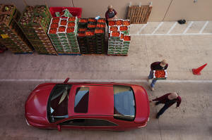 Volunteers help load vehicles during a food distribution at the San