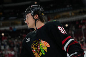 Chicago Blackhawks center Connor Bedard warms up before an NHL hockey
