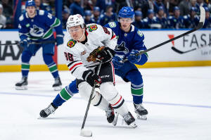 Chicago Blackhawks' Connor Bedard (98) and Vancouver Canucks' Lukas