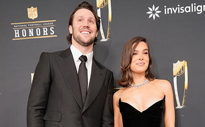 Buffalo Bills, and his fiancé, Hailee Steinfeld, pose on the red