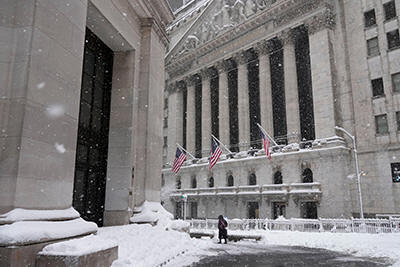 outside the New York Stock Exchange during a snow storm, Monday,
