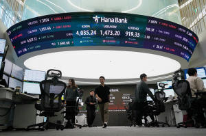 exchange dealing room of the Hana Bank headquarters, in Seoul, South