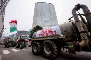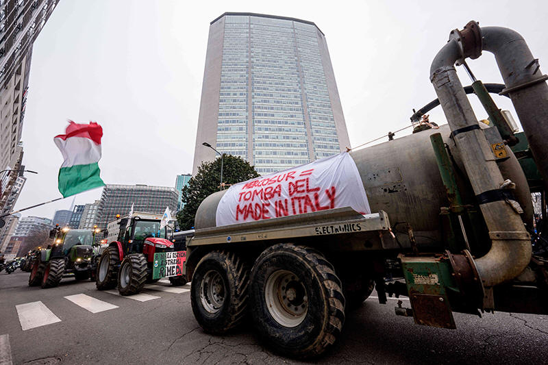 A banner with writing in Italian "Mercusur, the tomb of made in