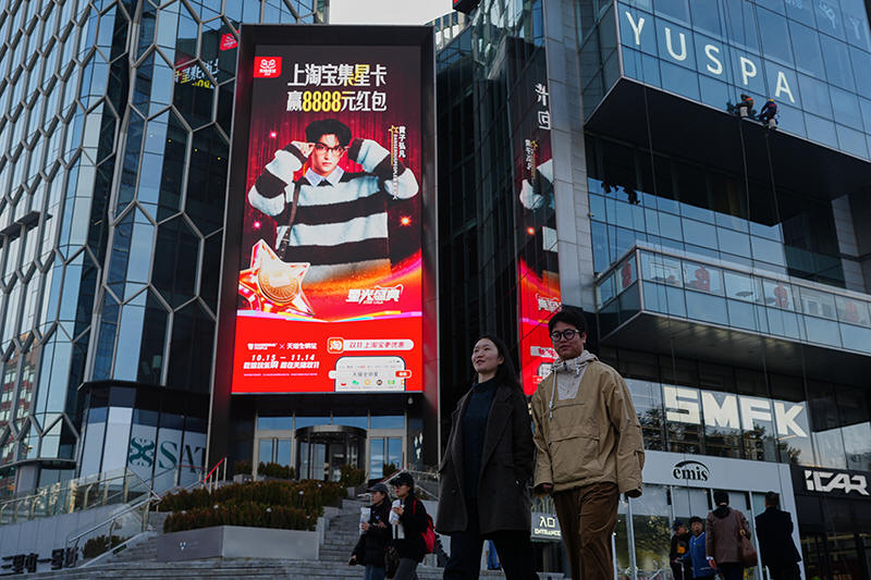 People walk by an advertisement billboard promoting Tmall's Singles'