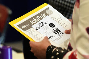 A job seeker waits to talk to a recruiter at a job fair Aug. 28,