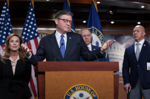 Speaker of the House Mike Johnson, R-La., gestures as he and the GOP