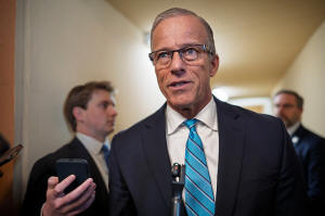 Senate Majority Leader John Thune, R-S.D., talks to reporters about