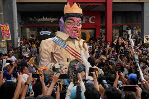 Protesters destroy an effigy of Philippine President Ferdinand