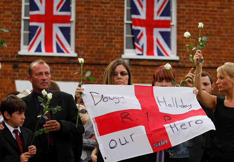 killed in Afghanistan, line a street as his coffin is driven through