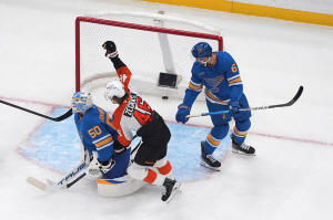 The Flyers outshot the Blues 5-1 in the scoreless overtime.