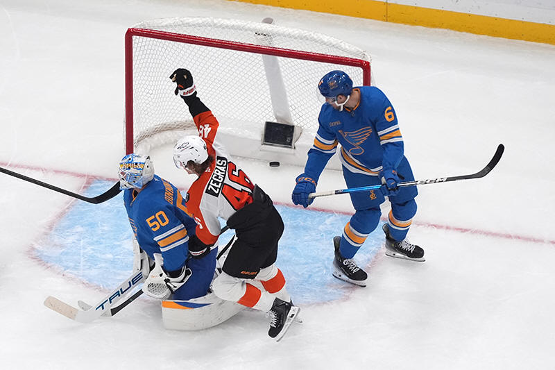 Philadelphia Flyers' Trevor Zegras (46) scores past St. Louis Blues'