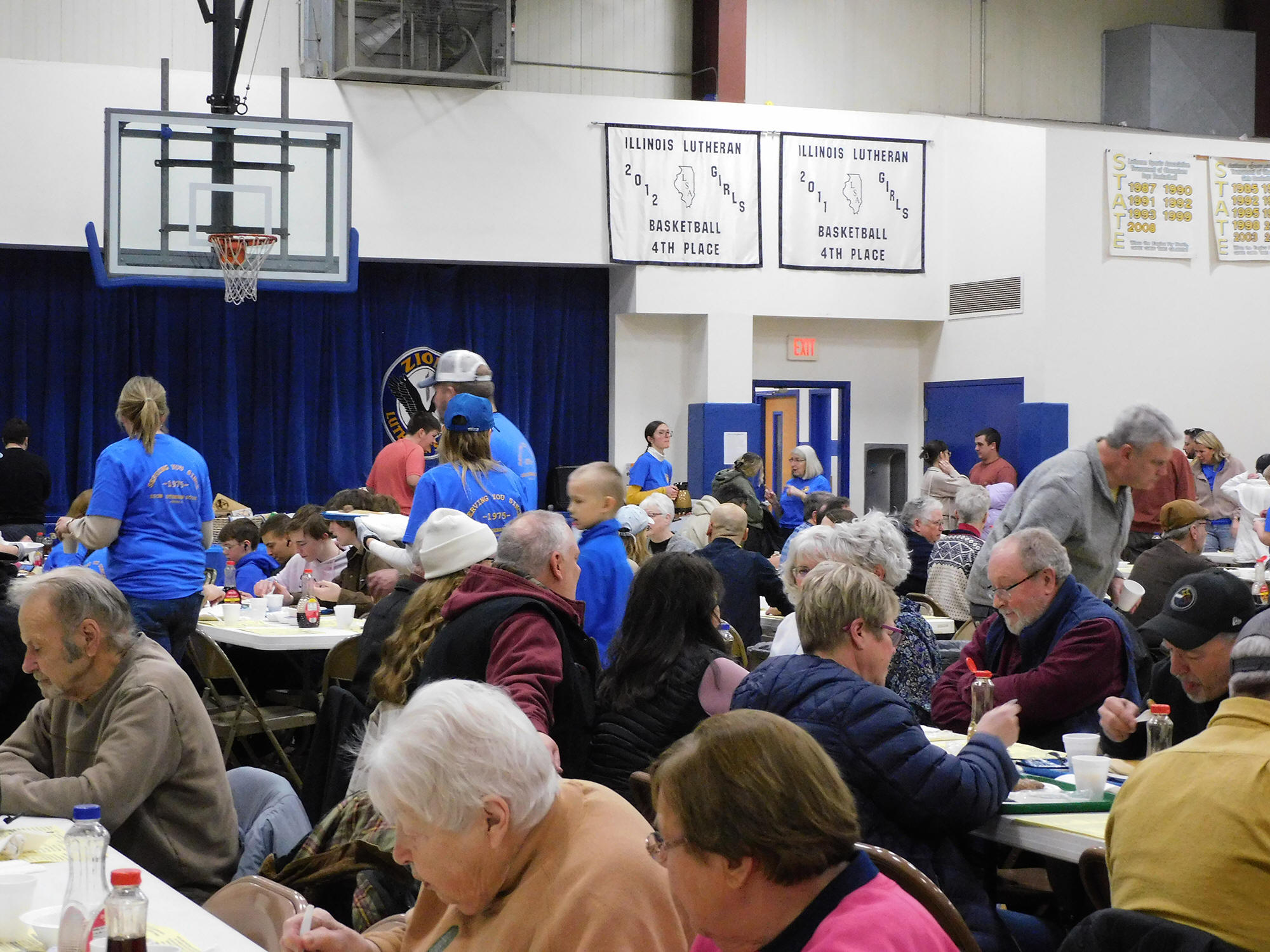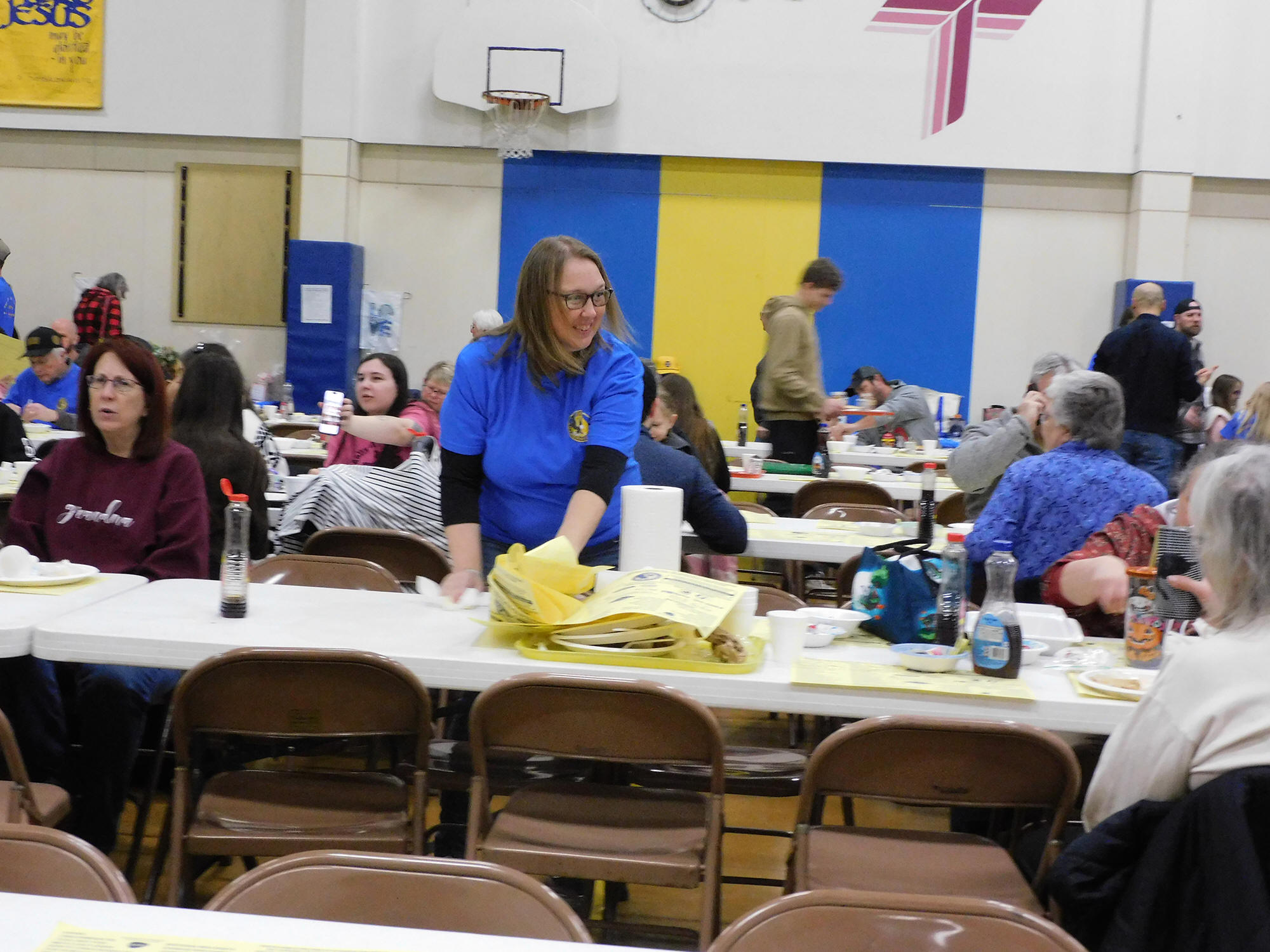 volunteers roaming the aisles ready to heap on seconds of pancakes
