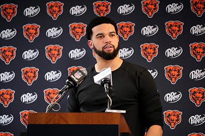 quarterback Caleb Williams speaks during a news conference after an