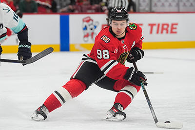 center Connor Bedard handles the puck during the second period of an