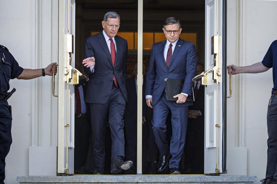left, and Speaker of the House Mike Johnson, R-La., right, arrive