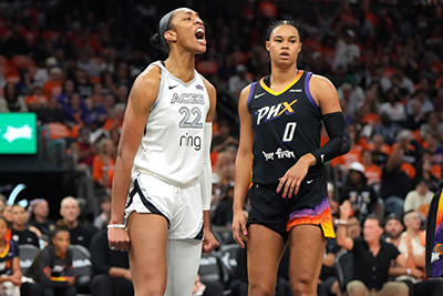 A'ja Wilson (22) reacts after scoring on Phoenix Mercury forward