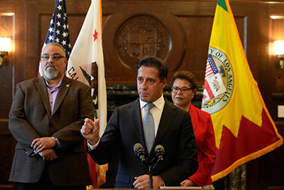 the media at Riviera Country Club in Los Angeles, Tuesday, Feb. 17,