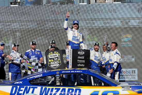 Ryan Blaney celebrates in Victory Lane after winning a NASCAR