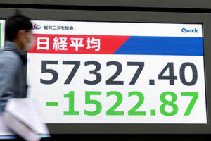 People walk in front of an electronic stock board showing Japan's