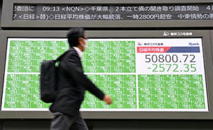 A person walks by an electronic stock board showing Japan's Nikkei