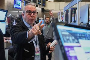 Options trader Joseph D'Arrigo works on the floor of the New York