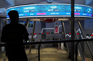 A man stands near an electronic board displaying stock prices and