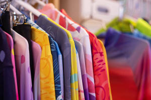 Terry Precision Cycling bike shirts hang on a rack at the company’s
