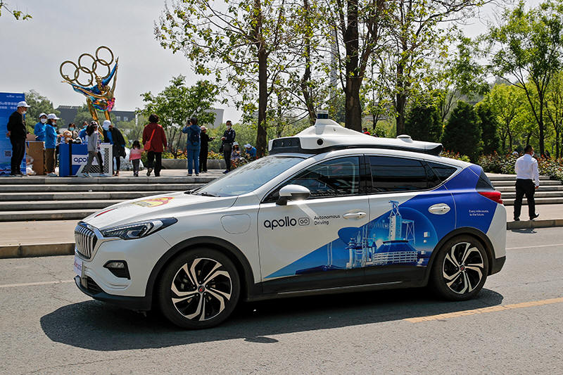 A Baidu Apollo Robotaxi passes its customer service counter setup at the