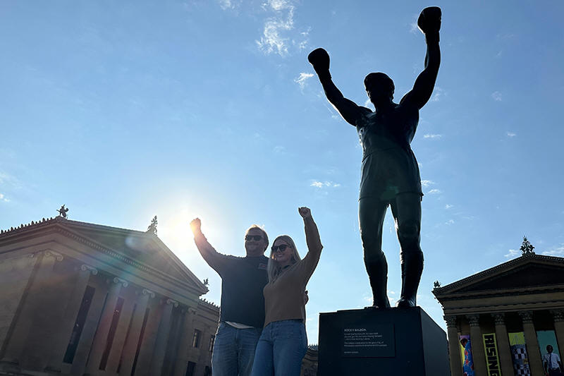 Visitors pose in front of the Rocky statue at the Philadelphia