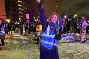 flashlight toward the bundled-up well-wishers below with her