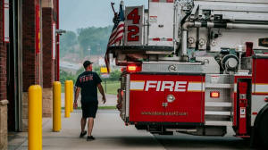A firefighter walks beside a fire truck outside a fire station.