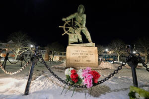 Flowers are seen placed at the Gloucester Fisherman's Memorial in