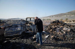 Mohammad Dalal looks at scorched cars in his scrapyard that was set