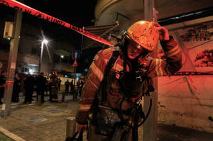 An Israeli first responder walks from the site of a missile strike