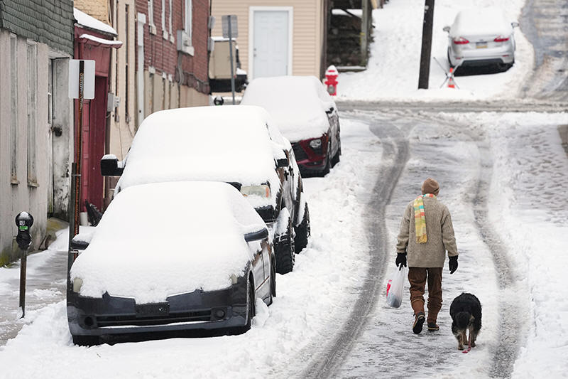 A person walks a dog on a slushy street after a winter snow storm in