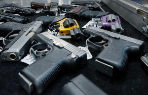 In this Jan. 26, 2013, file photo, handguns are displayed on a