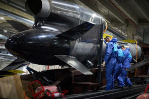 Workers inspect a Flamingo cruise missile at Fire Point's