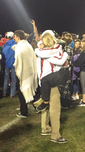 Railer head football coach Matt Silkowski lifts his wife Lauren off