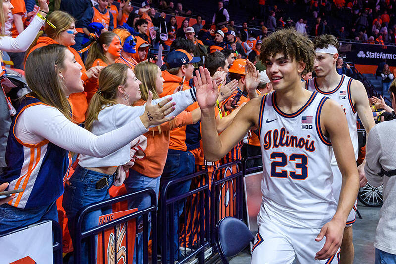 Illinois' Keaton Wagler celebrates with fans during an NCAA college
