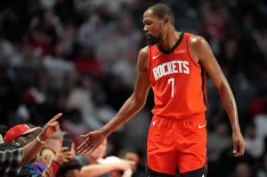 Houston Rockets forward Kevin Durant (7) greets fans during the