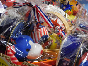 “thank you” necklace, a red, white, and blue rubber duckie, and a